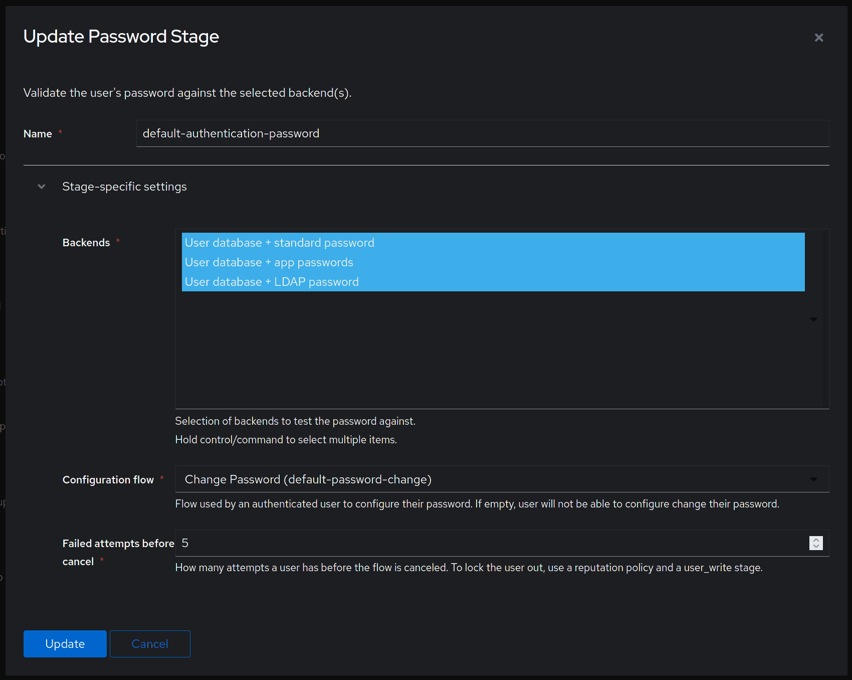 Lastly, verify that the "User database + LDAP password" backend is selected in the "Password Stage" under Flows > Stages.
